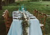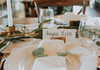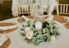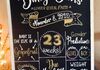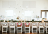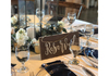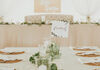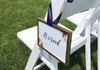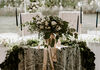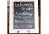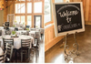 30" Black Spandex Table Cover, 5' Round Table, White Resin Padded Chair, Wood Slabs, White Chalkboard Frame, Special Order Runners
