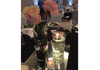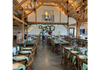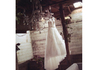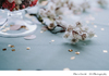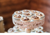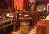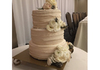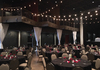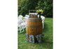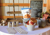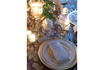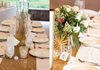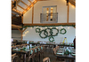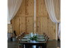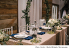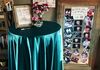 10' x 10' White Sheer Drape, 29" x 36" White Chalkboard, Curtain String Lights, Stained Wine Barrel, 14' Sateen Poly Table Skirt, 3-Tier Wood Dessert Stand, 12" Gold Rope Edge Charger Plate, Bistro String Lights