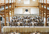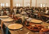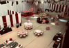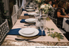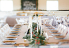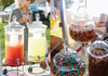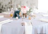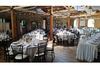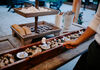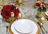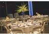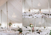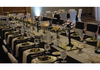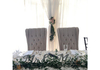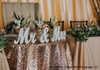 Sequin Runners, Mahogany Chiavari Chair, Rolltop Chafing Dish, 12" Champagne Charger Plate, Crystal Beaded Chandelier with Extension, White Resin Padded Chair, Stained Wine Barrel, 13" Frosted Beaded Charger Plate