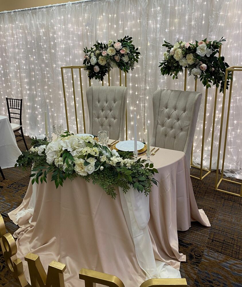 Double Entry Door, Cape Winds Arch, 24" Hourglass Vase, Colonade Arch, 10' x 10' White Sheer Drape
