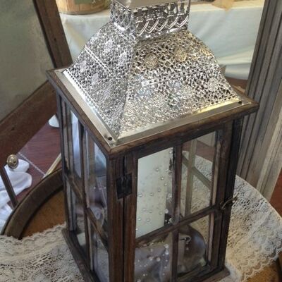 10' x 10' White Sheer Drape, 29" x 36" White Chalkboard, Curtain String Lights, Stained Wine Barrel, 14' Sateen Poly Table Skirt, 3-Tier Wood Dessert Stand, 12" Gold Rope Edge Charger Plate, Bistro String Lights