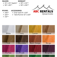 Once you have determined your linen size(s), stop into our showroom at 3009 S. Phillips Avenue to see samples of each fabric or call us to make a reservation. Please note: All linen orders must be finalized 2-weeks prior to your event.