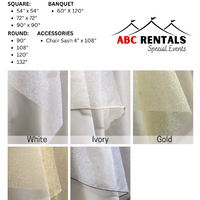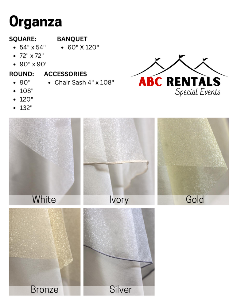 Once you have determined your linen size(s), stop into our showroom at 3009 S. Phillips Avenue to see samples of each fabric or call us to make a reservation. Please note: All linen orders must be finalized 2-weeks prior to your event.