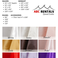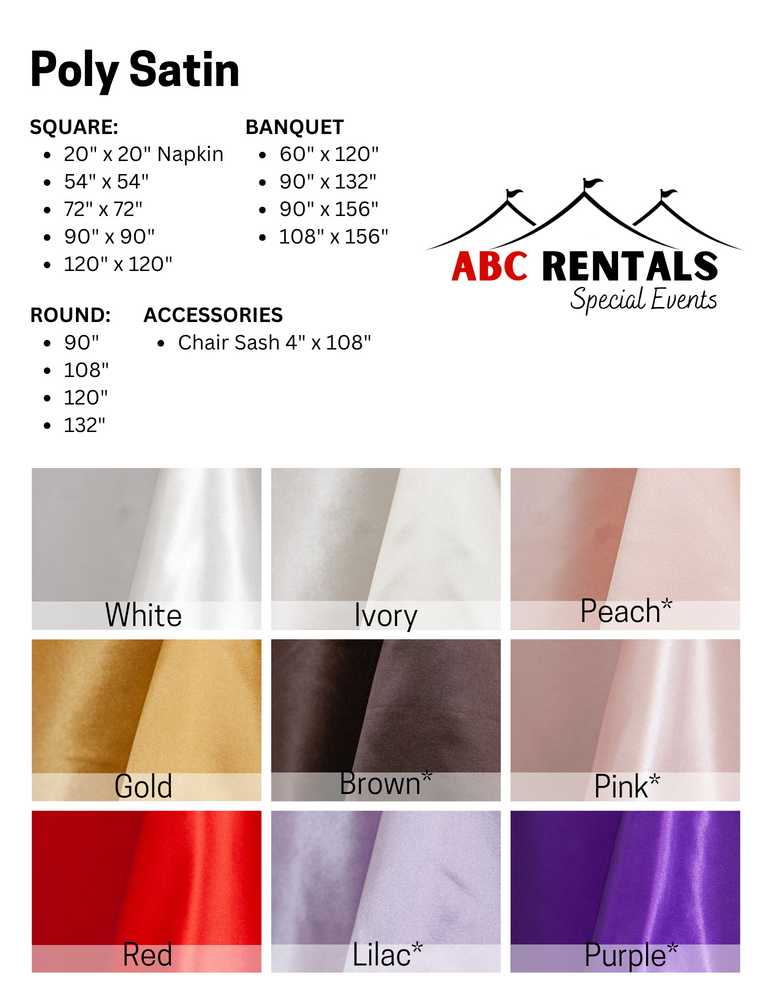Once you have determined your linen size(s), stop into our showroom at 3009 S. Phillips Avenue to see samples of each fabric or call us to make a reservation. Please note: All linen orders must be finalized 2-weeks prior to your event.