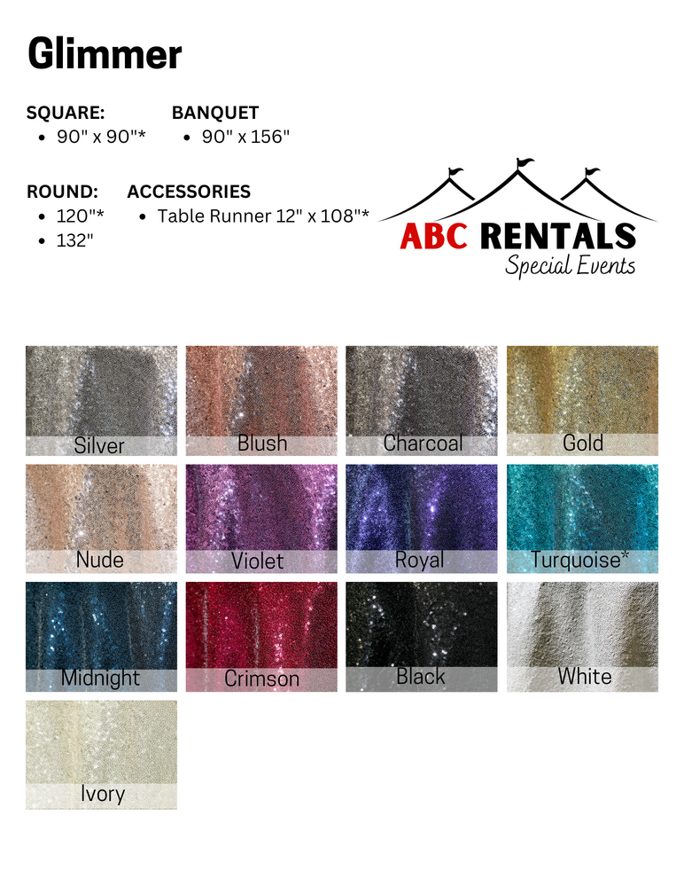 Once you have determined your linen size(s), stop into our showroom at 3009 S. Phillips Avenue to see samples of each fabric or call us to make a reservation. Please note: All linen orders must be finalized 2-weeks prior to your event.