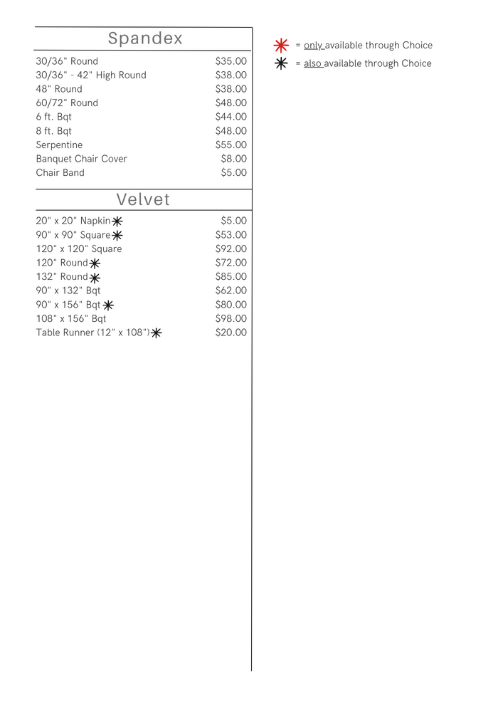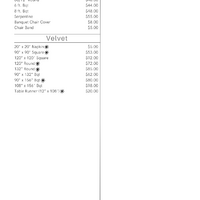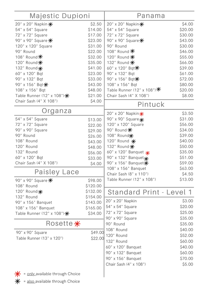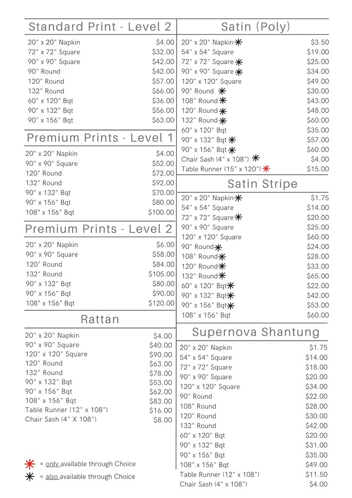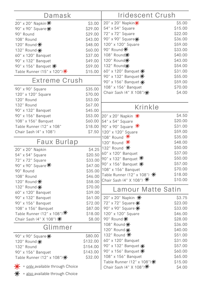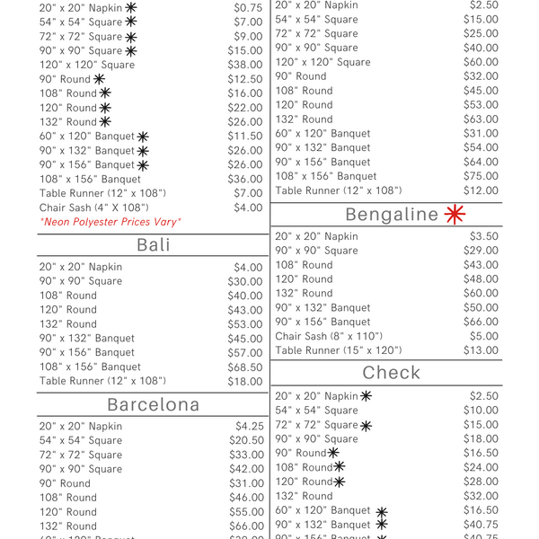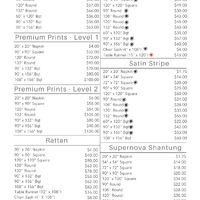 Linens > Specialty Linens > Specialty Linen Price Sheet