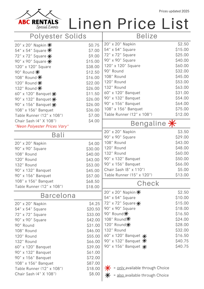 Download and Print the Specialty Linen Price Sheet on our Forms Page.