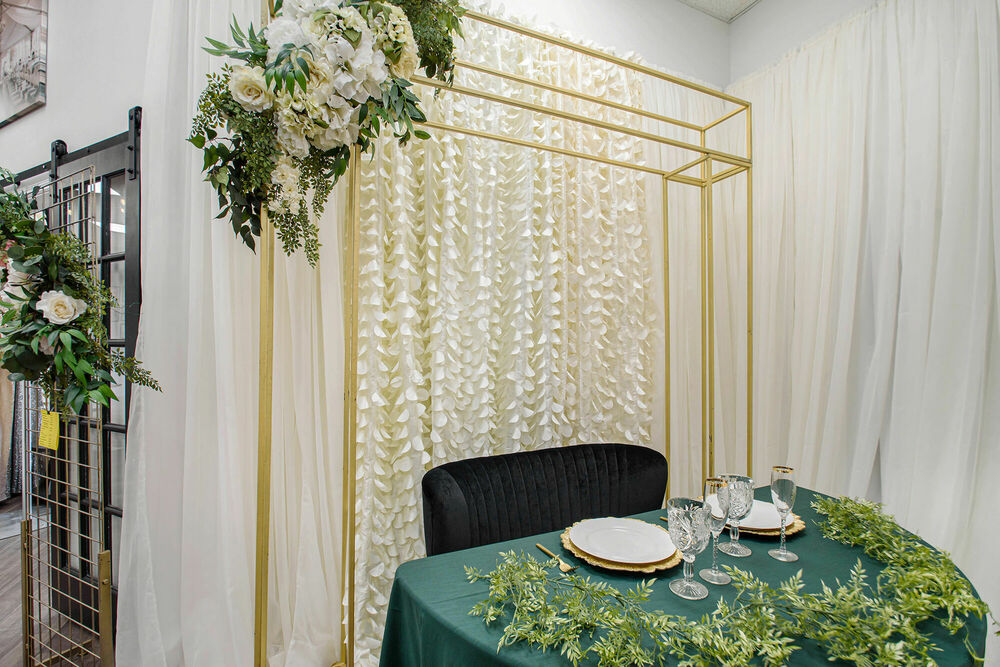 Double Entry Door, Cape Winds Arch, 24" Hourglass Vase, Colonade Arch, 10' x 10' White Sheer Drape