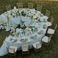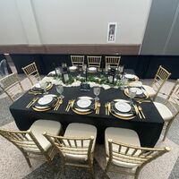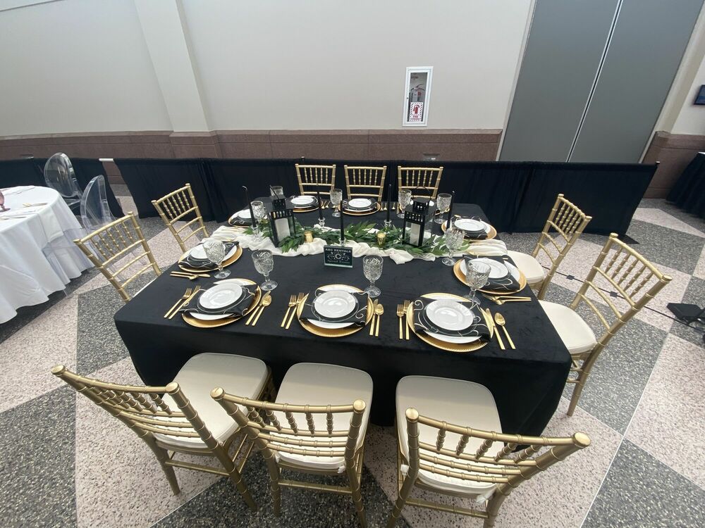 Sequin Runners, Mahogany Chiavari Chair, Rolltop Chafing Dish, 12" Champagne Charger Plate, Crystal Beaded Chandelier with Extension, White Resin Padded Chair, Stained Wine Barrel, 13" Frosted Beaded Charger Plate