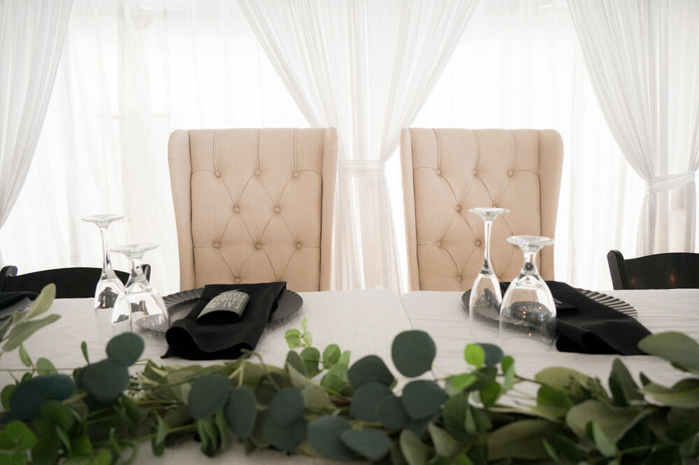 30" Black Spandex Table Cover, 5' Round Table, White Resin Padded Chair, Wood Slabs, White Chalkboard Frame, Special Order Runners