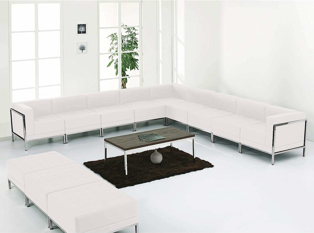 This contemporary White Lounge Furniture features smooth back and tufted seats, foam filled cushions, and integrated stainless steel legs. PRICING PER PIECE. Middle Chairs, Left Corners, or Right Corners available. Dimensions: Seat Size: 28''W x 22''D x 17.25''H . Back Size: 28''W x 10.5''H