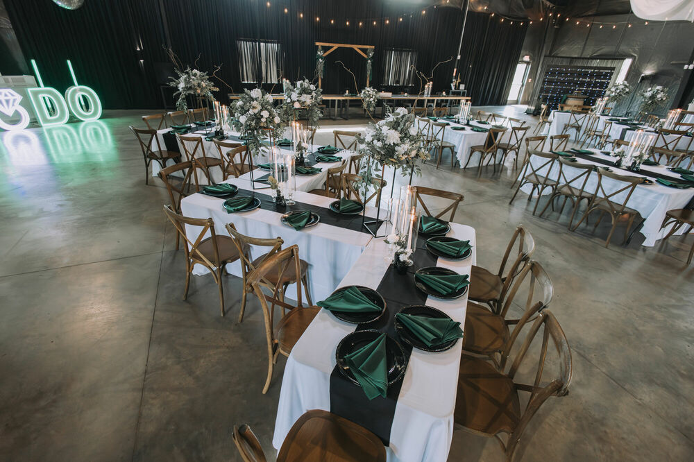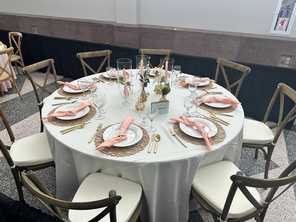 30" Black Spandex Table Cover, 5' Round Table, White Resin Padded Chair, Wood Slabs, White Chalkboard Frame, Special Order Runners