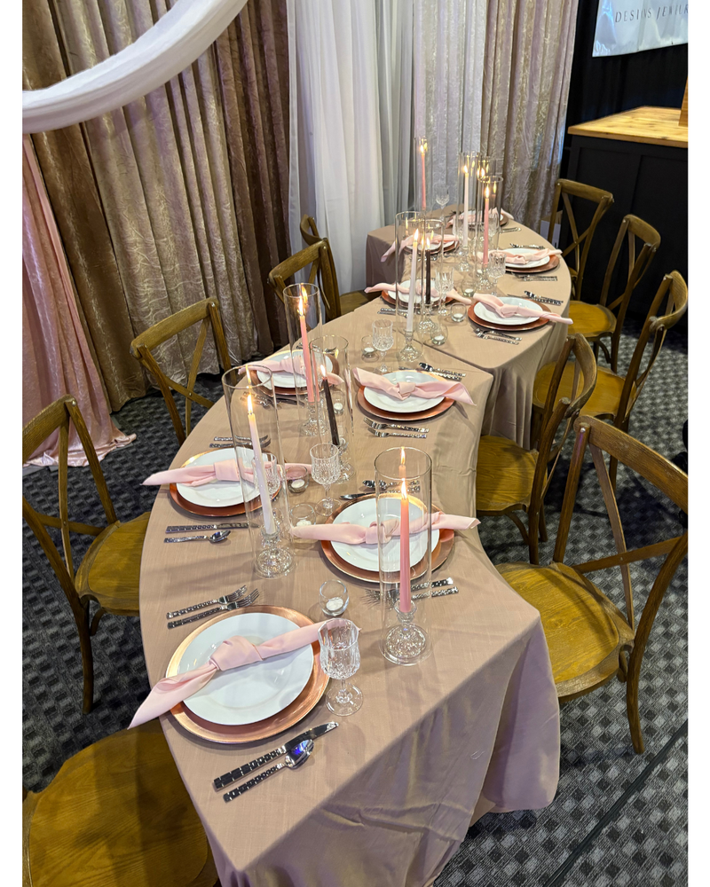 Sequin Runners, Mahogany Chiavari Chair, Rolltop Chafing Dish, 12" Champagne Charger Plate, Crystal Beaded Chandelier with Extension, White Resin Padded Chair, Stained Wine Barrel, 13" Frosted Beaded Charger Plate