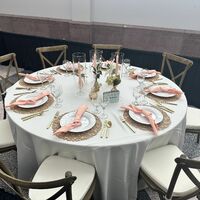 10' x 10' White Sheer Drape, 29" x 36" White Chalkboard, Curtain String Lights, Stained Wine Barrel, 14' Sateen Poly Table Skirt, 3-Tier Wood Dessert Stand, 12" Gold Rope Edge Charger Plate, Bistro String Lights