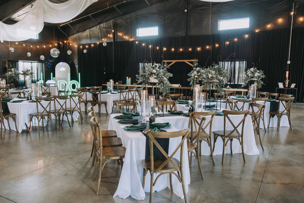 Chairs, Tables, Popcorn Machine, Drape, Chalkboard, Arches, Cake Stand, wedding tent